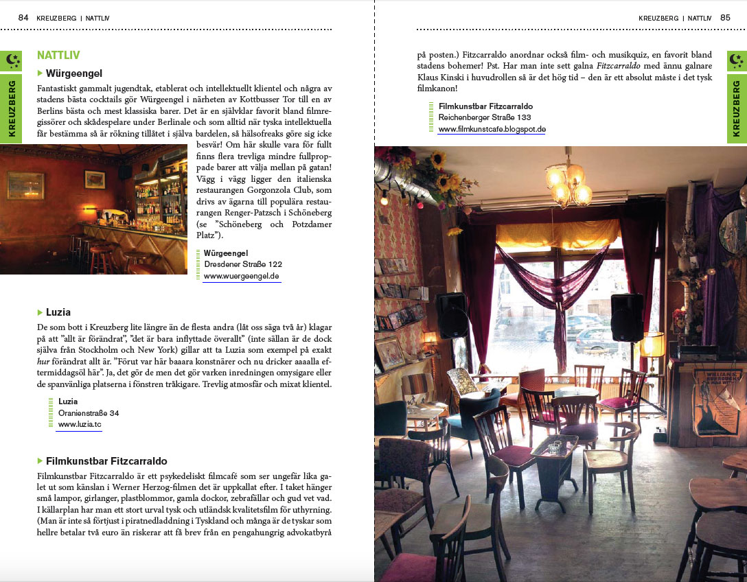 »Ovärdelig bok för berlinbesökaren som vill upptäcka det riktiga Berlin. En kul mix av ”måsten” och gömda pärlor som enbart lokalborna känner till. Författaren har också lyckats klämma in fantastiska tips på mat, caféer, ölställen som känns varken uttjatade eller turistinvaderade. Definitivt den enda guideboken till Berlin som andas nutid.« Boktipset