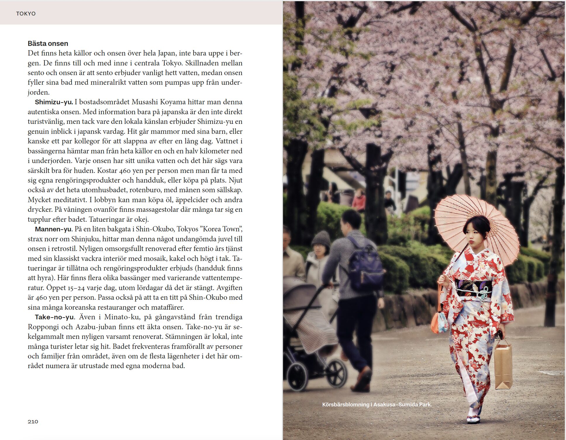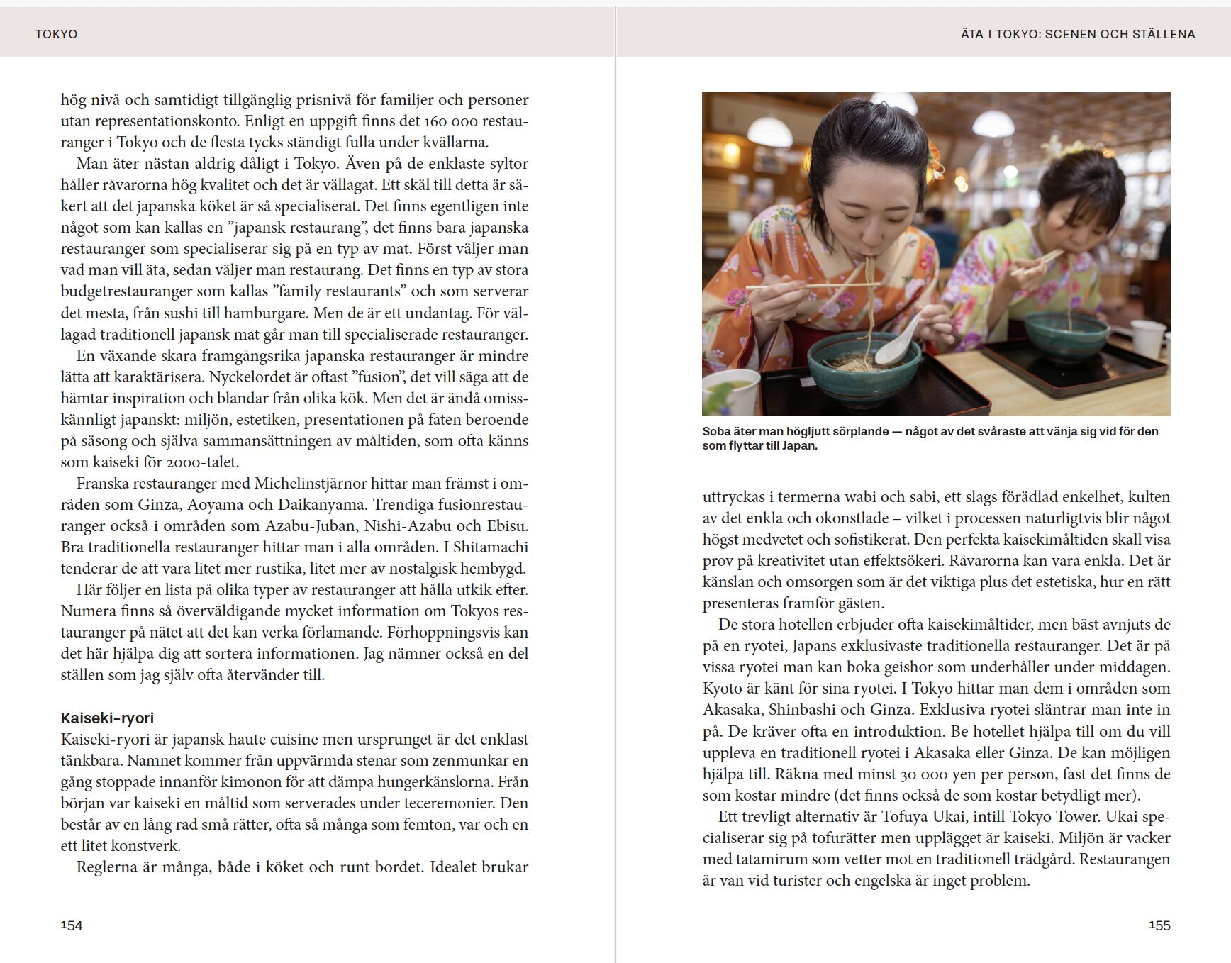 Han tipsar till exempel om vad som är värt att se i varje stadsdel, intressanta områden och gator, och enastående arkitektur. Läs om landets religioner och vad som är speciellt för den traditionella japanska kulturen, med allt från teceremonier till de olika konstarterna. Dessutom avslöjar Kjell Fornander sina favoriter bland några av stadens alla kaféer och skriver om hotell anpassade för olika budgetar.